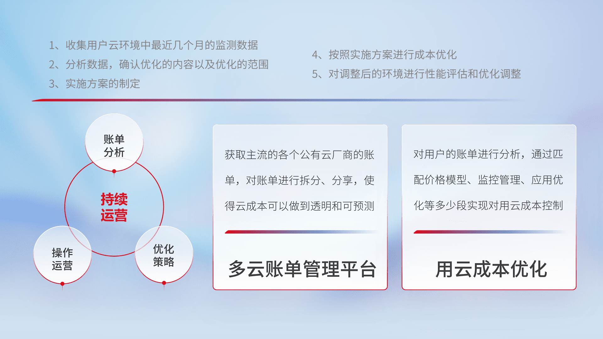 通过多云纳管,,,以统一的资源数据模型把客户的云资源进行抽象和封装,,进而实现对多云资源的统一操作,,,,保障云资源管理的可靠性、、、稳定性与可用性。。。量身定制化运维内容,,配置、、、、开发运维、、、、补丁管理、、、、备份、、、监控、、认证和访问管理、、、、审计和日常巡检等,,,,保障在用云过程中的可靠度,,稳定度以及高可用率。。。