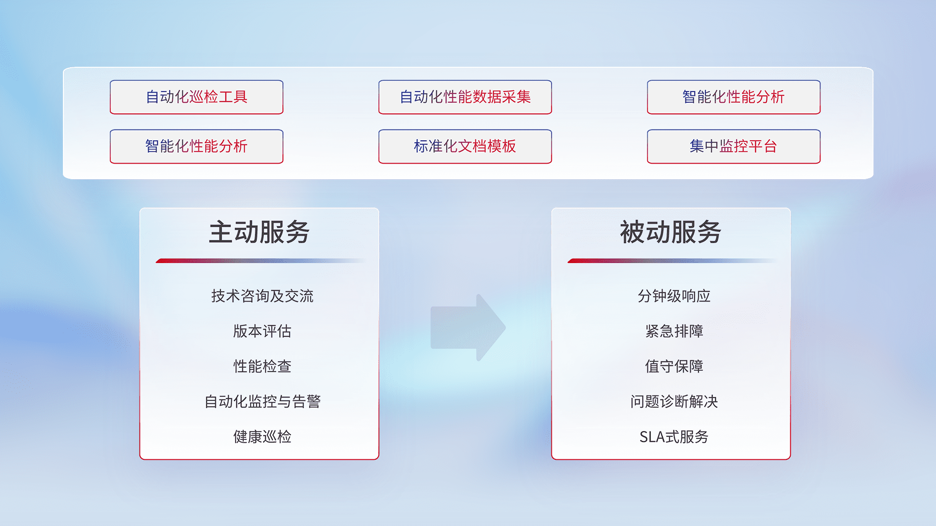 智能化工具和标准化文档,,保障服务质量,,,,提供主动服务(包含技术咨询、、、、版本评估、、性能检查、、、、自动化监控与告警、、健康巡检)和被动服务包含(分钟级响应、、、紧急排障、、、、值守保障、、、问题诊断解决、、、、SLA服务)。。。。