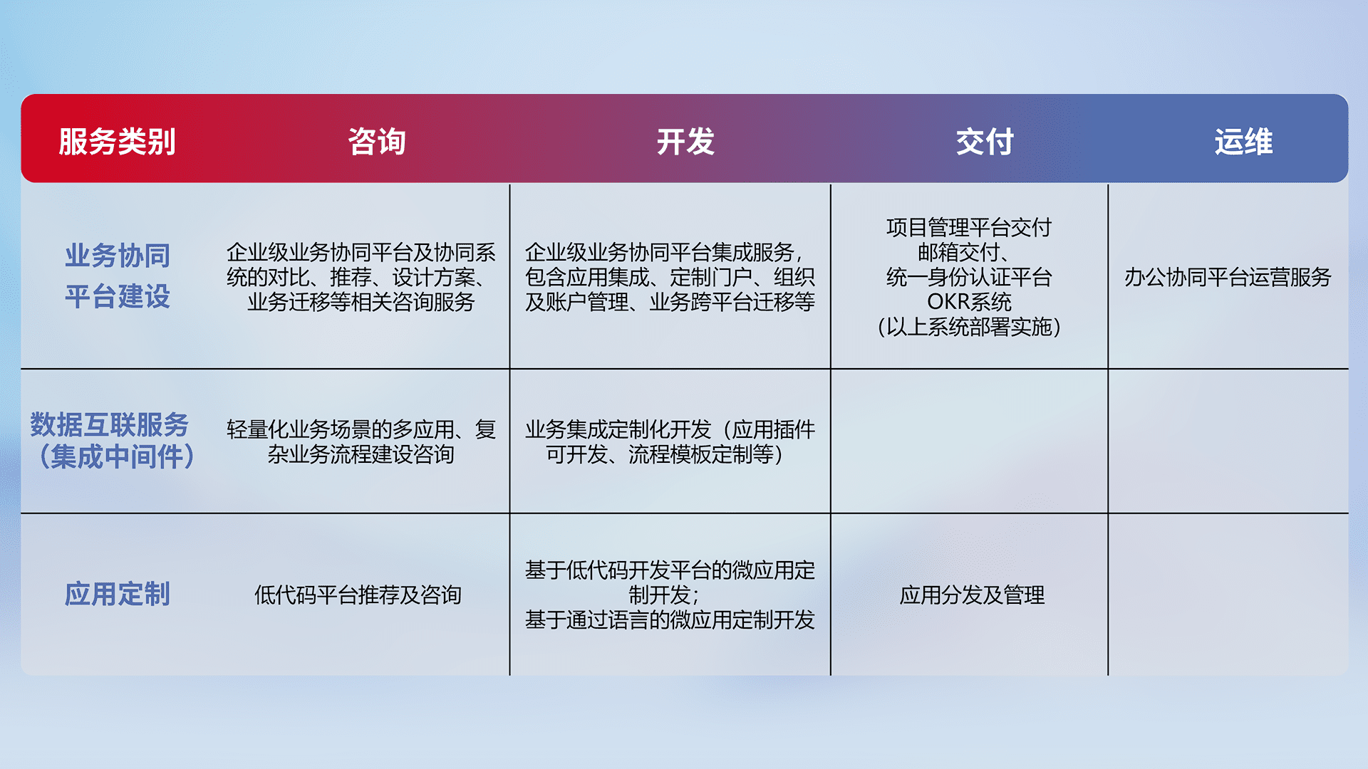 针对钉钉、、、企微、、IDaas等平台级产品提供产品的规划、、、、方案、、、交付、、、、定制化开发等服务,,,,实现如统一协同办公、、智能客户服务、、、混合会议管理、、、、智能数据查询、、等业务场景,,,,实现数字化转型。。